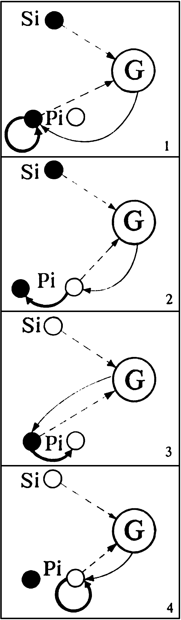 Из рисунка видно, что в зависимости от исходных состояний триггеров Si и Pi можно выделить четыре типа элементов нейронной сети - 1, 2, 3, 4. В частности, если эти состояния одинаковы, то под действием оператора G состояние триггера Pi не меняется (элементы типа 1 и 4), а если они разные, то триггер Pi меняет своё состояние на противоположное (элементы типа 2 и 3). Иначе говоря, происходит "уравновешивание внутреннего состояния Р с состоянием внешней среды" (по Павлову)[1].