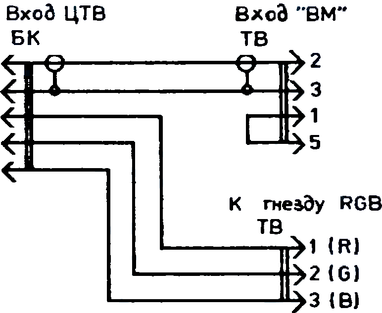 Цветной вариант. Прежде всего нужно сделать в телевизоре отсутствующий там RGB-вход. Эта переделка (кстати, по нашим сведениям, такая работа, выполненная без квитанции в телеателье, стоит 25 рублей, так что есть шанс сэкономить!) выполняется за считанные минуты по схеме, которая изображена чуть ниже. Следующий этап - доработать видеовход, как это делалось для черно-белого варианта. Последний этап - собрать кабель в точном соответствии с третьей схемой.