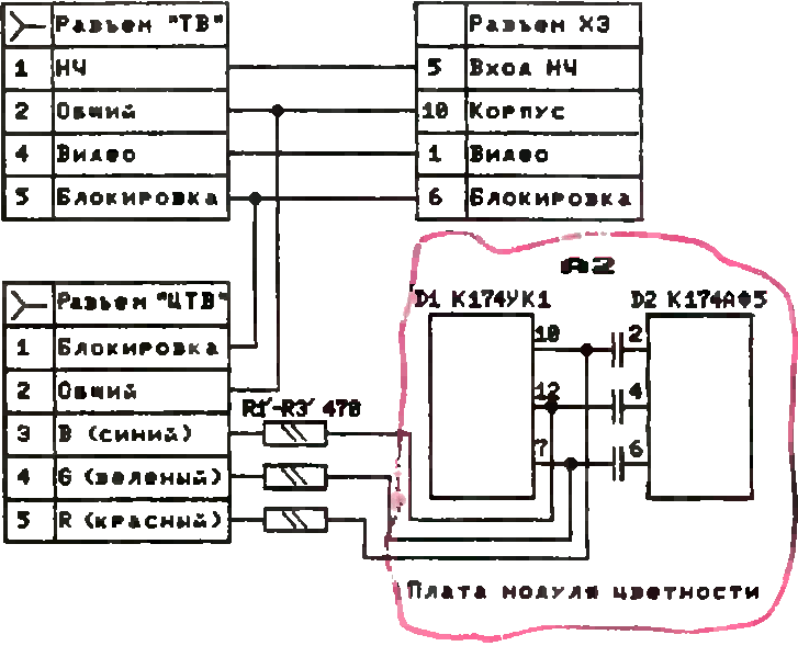 Отличительная особенность рассматриваемой схемы состоит не только в том, что для своей реализации она требует минимум дополнительных радиоэлементов, но также и в том, что её выходные R, G, В сигналы являются инвертированными по отношению к сигналам цветности, которые получаются на выходе схемы, опубликованной в журнале «Информатика и образование» (1989, № 2). Необходимость инвертирования сигналов цветности может возникнуть и при использовании других типов цветных телевизоров.