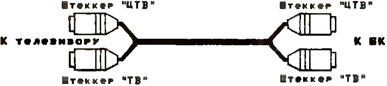 Подключение БК к телевизору для работы с цветом осуществляется с помощью соединительного кабеля, показанного на рис. 2. Для перехода в режим чёрно-белого изображения достаточно просто вынуть штекер ЦТВ из одноименного разъёма компьютера (и перевести в соответствующее положение переключатель, если он используется). Автоматическое переключение телевизора из режима работы с компьютером в обычный режим показа телевизионных передач происходит при отключении от разъёмов ТВ и ЦТВ телевизора обоих штекеров соединительного кабеля.
