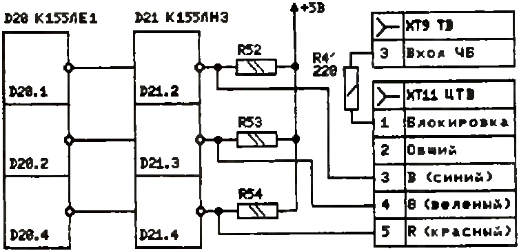 При доработке БК-0010 необходимо разъём компьютера ХТ9 (ТВ) перепаять согласно схеме распайки разъёма ТВ телевизора. Для этого контакты 1 и 5 разъёма ХТ9 сначала необходимо освободить от всех старых связей. Затем его контакт 1 нужно соединить с контактом 5 разъёма ХТ4 (МГ). Дополнительный разъём XT11 (ЦТВ), устанавливаемый в компьютере рядом с разъёмом ХТ9, распаивается в соответствии со схемой, показанной на рис. 3. Дорожку, связывающую вывод 13 микросхем D20 (по схеме БК-0010) с выводом 5 микросхем D21, необходимо перерезать. Соединение выхода элемента D20.4 с выводом 5 микросхемы D21 выполняется отрезком тонкого проводника навесным способом.