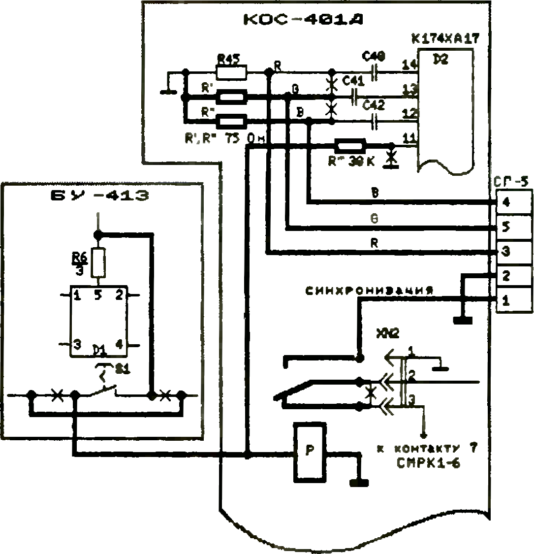 На кассете обработки сигналов КОС-401Д телевизора необходимо разорвать цепи, помеченные на рисунке крестиками, и добавить элементы соединения, изображённые толстыми линиями.