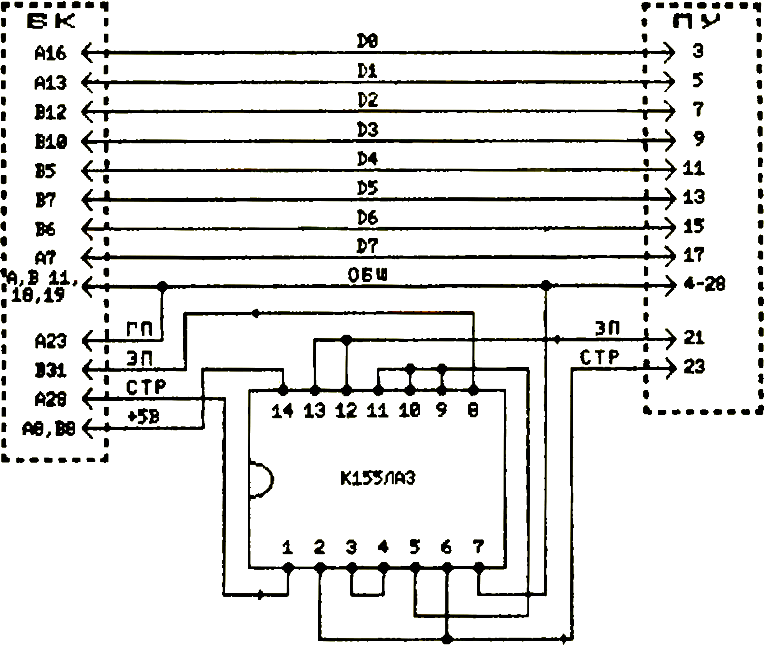 - номера проводов в жгуте, к которым подключены выводы D14 - 1 -16 (AD0- AD15), 22 (IАКО), 27 (INIT), 31 (SEL1), 32 (SEL2), 17 (SINC), 35 (DIN), 34 (DOUT), 20 (WTBT); выводы DMGO и BSY ни с чем не соединены;