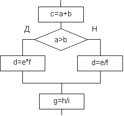 Как видно из блок-схемы, первые и последние операторы в ветвях альтернативы одинаковы. Если первые операторы одинаковы, их можно вынести из альтернативы и поставить до неё. Если одинаковы последние операторы, их можно поставить после альтернативы. В результате мы сэкономим два оператора, и блок-схема примет следующий вид: