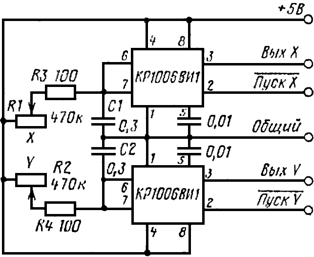 Ждущие мультивибраторы по запуску от машины генерируют ТТЛ-импульсы высокого уровня (выводы 3 микросхем таймеров), их длительность пропорциональна сопротивлению соответствующего координатного потенциометра (X или Y). Конденсатор С1 и потенциометр R1 вместе с регистром R3 образуют времязадающее RC-звено мультивибратора.