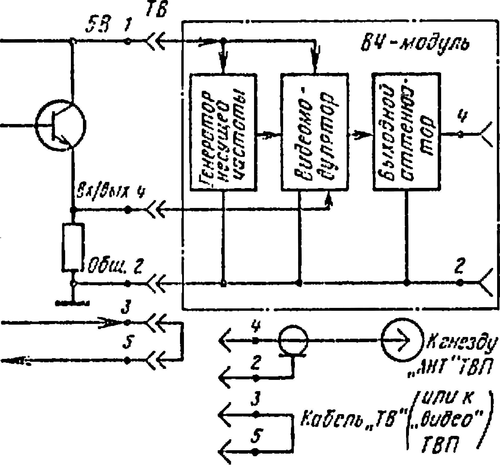 «Электроника БК-0010» имеет выход ТВ, к которому подключается кабель ВЧ-модуля либо кабель ТВ для соединения с видеовходом ТВП по варианту 1 (рис. 1). Можно использовать для этих целей и антенный вход.