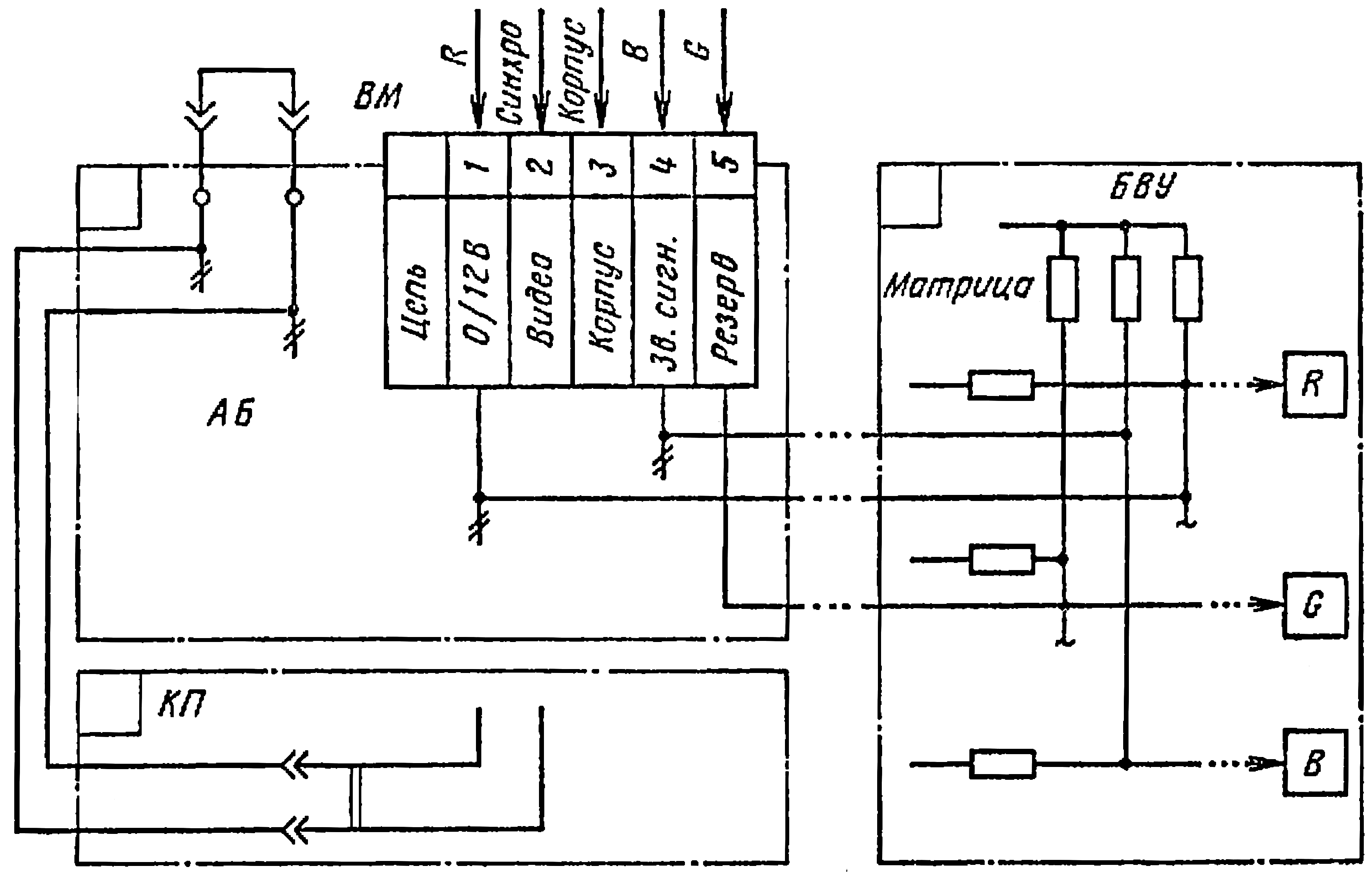 В выпускаемых отечественной промышленностью ТВП цветного изображения нет специального разъёма, с помощью которого можно коммутировать поступающие от ПЭВМ информационные R-, G-, В-видеосигналы и синхросмесь, как нет и внешнего переключателя, позволяющего отключать радиотракт на время прохождения информационных сигналов. Поэтому при сопряжении ЦТВ-выхода с ТВП цветного изображения необходимо дорабатывать ТВП, а иногда и ПЭВМ. Наиболее приемлемым представляется использование разъёма ВМ в качестве коммутирующего разъёма для стыковки. От разъёма ЦТВ (конт. 1) БК-0011 синхросмесь по кабелю ЦТВ поступает па вход разъёма ВМ (конт. 2, «видео»). Корпус БК-0011 (конт. 2 разъёма ЦТВ) с помощью того же кабеля соединяется с общей шиной ТВП (конт. 3 разъёма ВМ). Подобная коммутация необходима для синхронизации строчной и кадровой разверток любого выбранного типа ТВП синхросмесью ПЭВМ. Размах синхросмеси на ВМ-входе «видео» должен быть в пределах 0,7...1,4 В при входном сопротивлении 75 Ом. При отсутствии разъёма ВМ синхросмесь от ПЭВМ должна поступать в селектор синхроимпульсов ТВП, который необходимо согласовать с открытым выходом ПЭВМ.