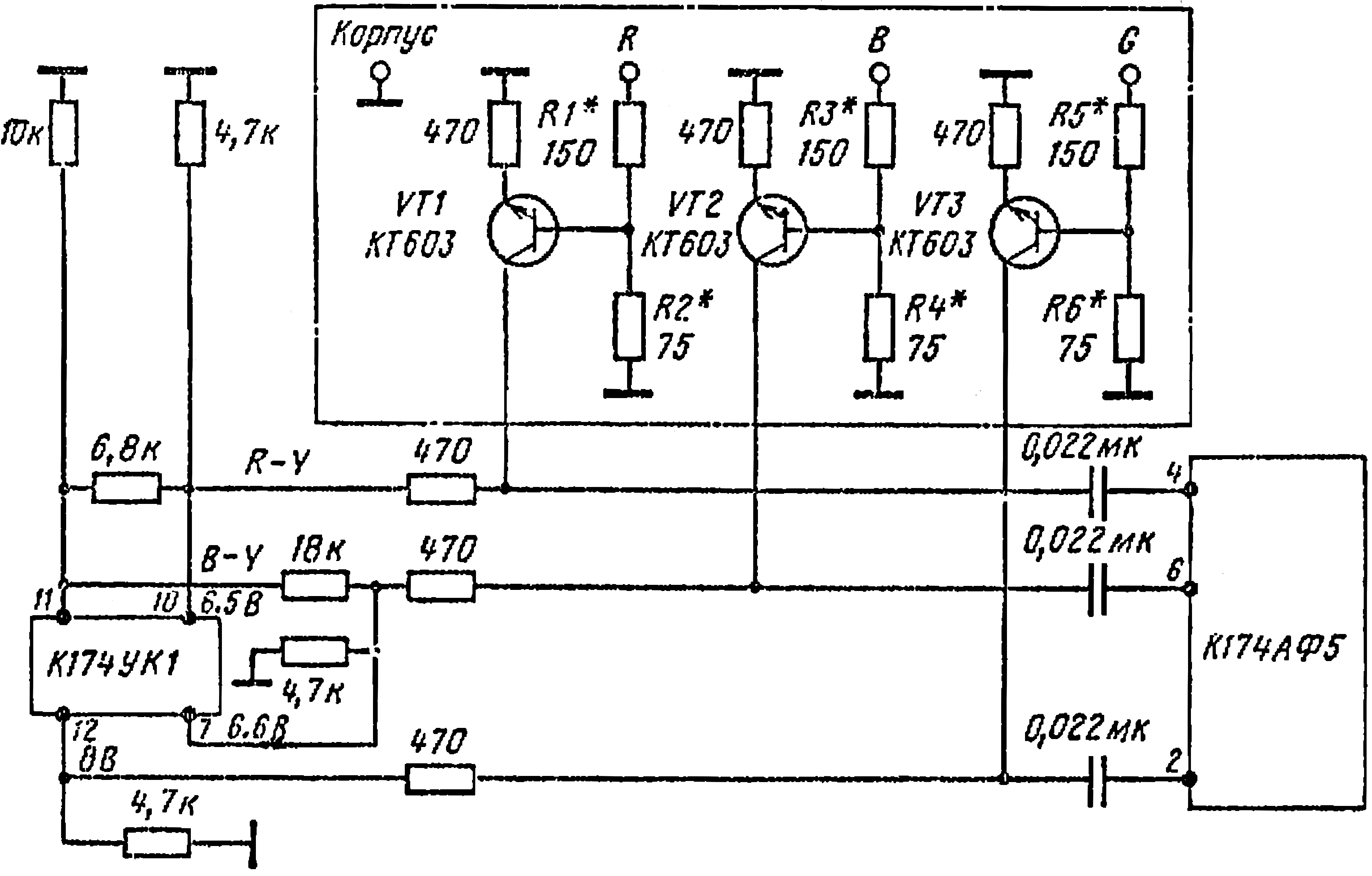 Электрическая схема согласования выходов первичных R-, G-, В-сигналов БК-0011 с каналом яркости (БВУ), разработанным на ИТС К174УК1, К174АФ5, показана на рис. 5. Канал яркости выполняется на основе типового включения ИМС, поэтому предлагаемая электрическая схема согласования справедлива для любых БВУ, собранных на указанных ИМС. Отличие от типового включения состоит лишь в том, что в цепи цветоразностных сигналов последовательно включаются резисторы 470 Ом, которые являются коллекторной нагрузкой соответствующих инвертирующих каскадов, собранных на транзисторах VT1...VT3. Все три инвертора полностью идентичны. Резисторы R2, R4, R6 служат для подбора требуемых размахов первичных сигналов цветности на выводах 2, 4, 6 К174АФ5. Номинальные значения сопротивлений резисторов R1, R3, R5 выбранных типовых ВЧ транзисторов средней мощности VT1...VT3, как правило, гарантируют требуемую АЧХ сигналов, а следовательно, и цветовую чёткость.