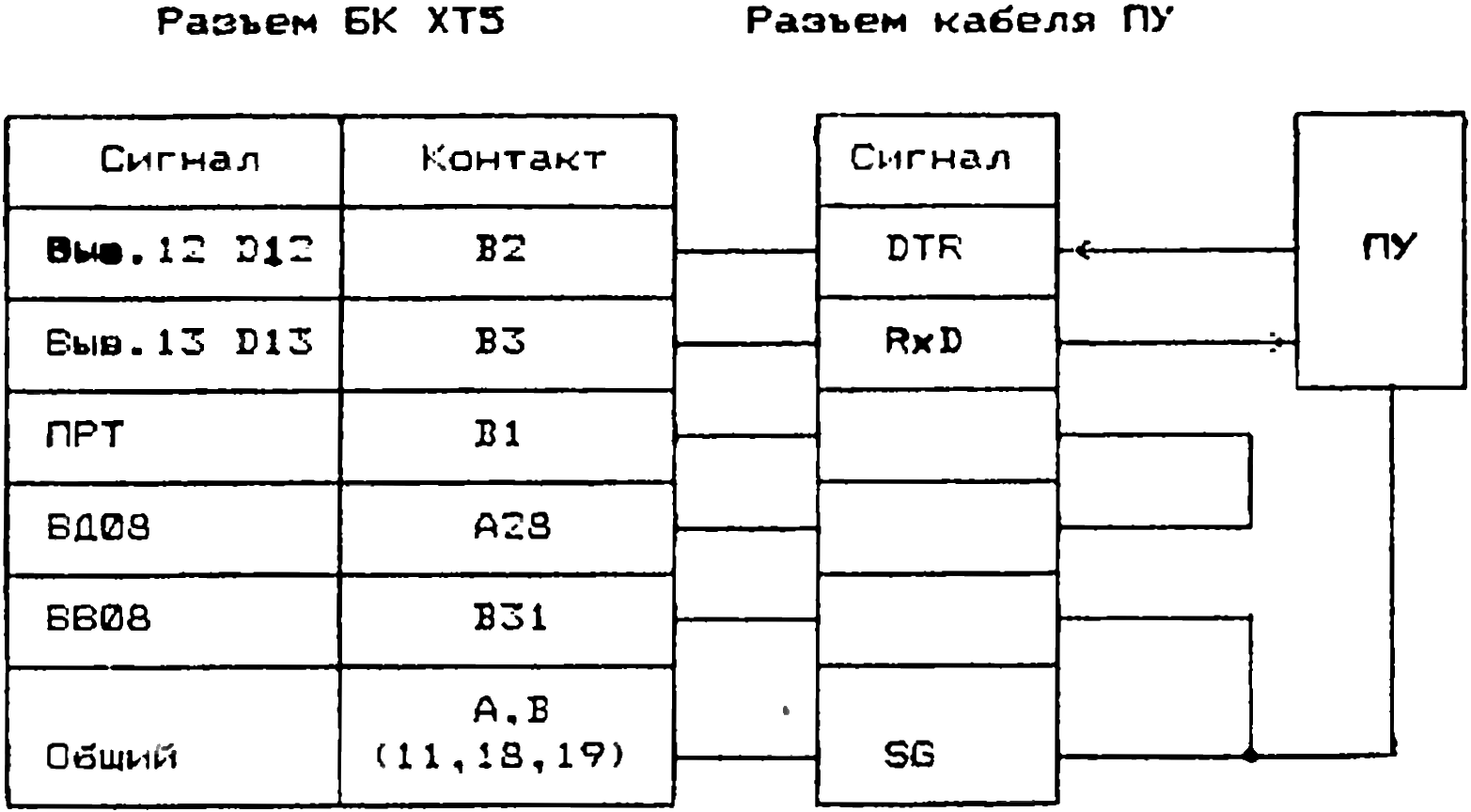 Таким образом, с аппаратной точки зрения для подключения к БК принтера с последовательным интерфейсом стандарта RS-232C (или ему подобных V24, стык С2) достаточно иметь трёхпроводной соединительный кабель, в котором к двум выше описанным линиям добавляется линия "земля". С программной точки зрения организация вывода данных на ПУ легко осуществляется путём размещения в программе пользователя запроса программного прерывания ЕМТ 42 или ЕМТ 46.