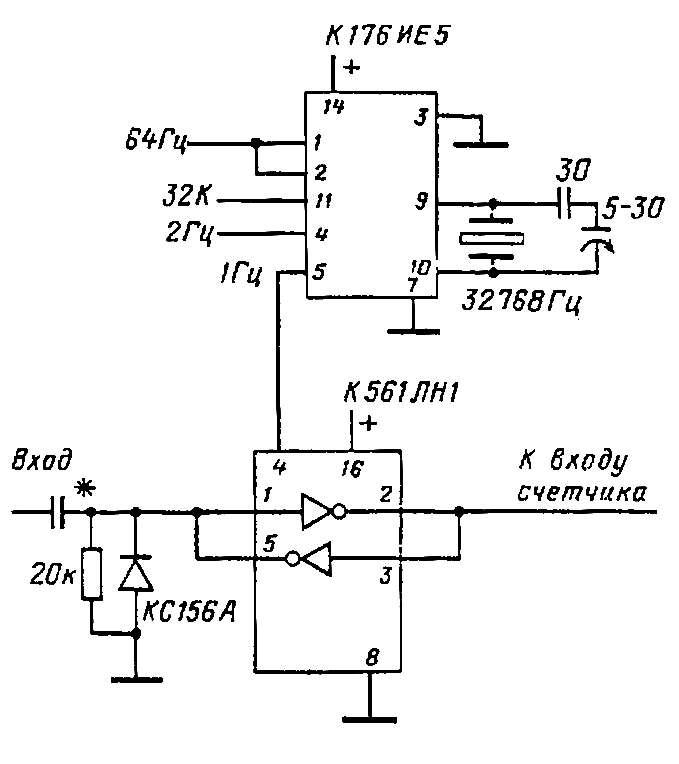 При попытке подключения часов или иного электронного устройства ко входу нашего счётчика может возникнуть очередная проблема - "сопряжение входов-выходов", особенно в тех случаях, когда подключаемое устройство питается от своего источника, да ещё и с иным напряжением питания. Можно было бы соорудить ещё какой-нибудь универсальный входной усилитель-формирователь, покрывающий большинство мыслимых потребностей. Но для начала следует воспользоваться более простой схемой действий: замкнув вход нашего формирователя страховочным сопротивлением (а для дополнительной острастки параллельно такому сопротивлению в 20 кОм можно подключить ещё и стабилитрон - КС147 или КС156), подавать на вход исследуемые импульсы через небольшой конденсатор. Ёмкость его следует подобрать опытным путём, постепенно увеличивая её до тех пор, пока импульсы не начнут уверенно засчитываться (после чего для верности эту ёмкость можно увеличить ещё примерно вдвое). Таким путём мы сможем для каждого источника сигналов подобрать свой входной конденсатор.