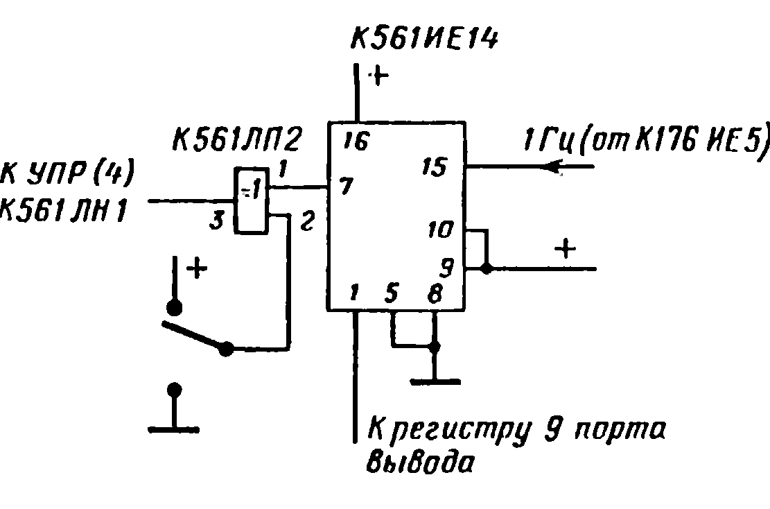 Если подать "меандр" частотой 1 Гц на "запрещающий" вход микросхемы К561ЛН1, наш формирователь будет периодически включаться и выключаться, образуя нужные нам серии. В разрывах этих серий после считывания результата мы заставим также БК производить и необходимое "обнуление" всех регистров счётчиков. Для этого мы подсоединим все входы сброса (R) счётчиков к одному из регистров порта вывода. Пусть это будет 10-й регистр (первые десять, начиная с нулевого и заканчивая номером девять, нам ещё понадобятся).