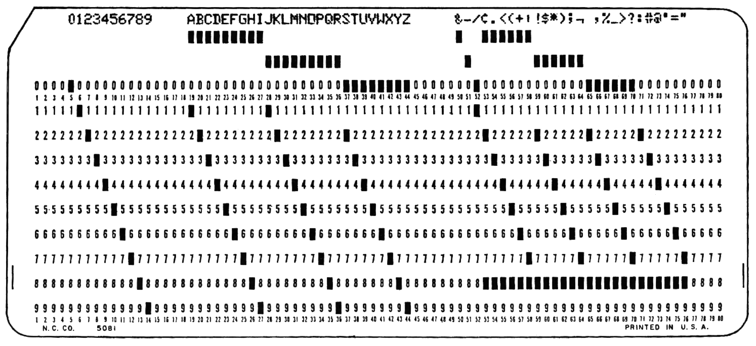 [5] Из этого правила существует несколько исключений, касающихся перфокарт специального назначения, таких как перфокарты конца файла, перфокарты с двоичным кодом, а также некоторых кодов расширенного алфавита, которые могут включать строчные буквы и управляющие символы.