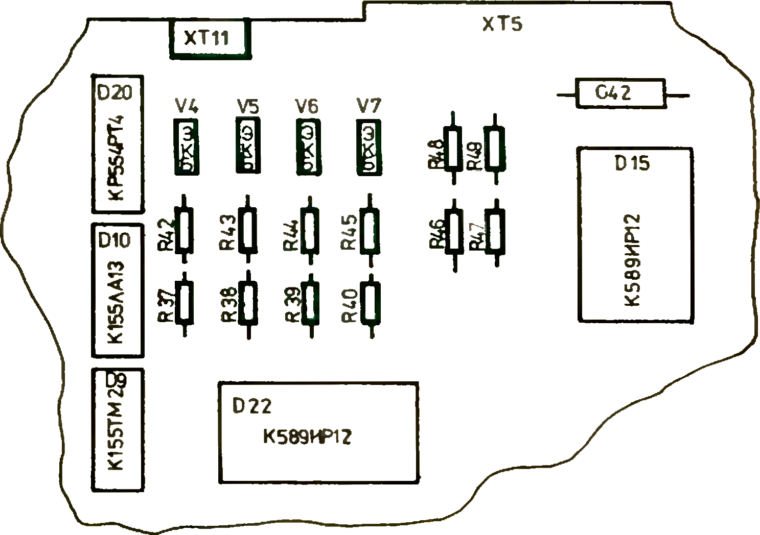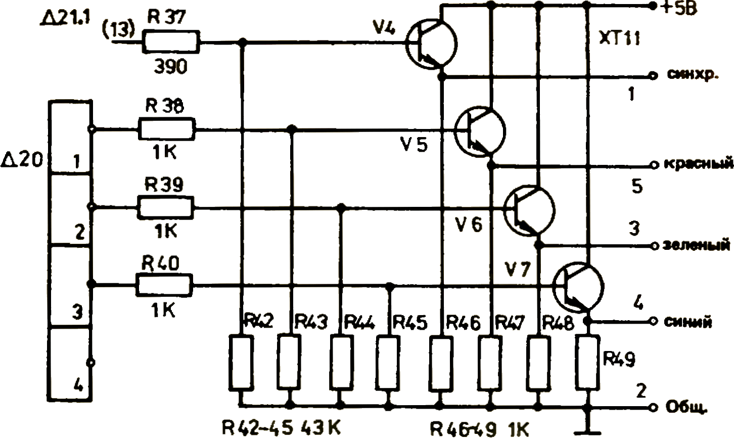 Несколько советов по практической части переделки. С основной печатной платы аккуратно удалите микросхему D20 К155ЛЕ1, обрежьте дорожки, ведущие к её выводам. На освободившееся место установите панельку для ПЗУ К556РТ4. От D20 осталось только 14 отверстий, поэтому два «лишних» вывода панельки осторожно отогните в стороны. Микросхему К555ТМ9 установите на свободное место, а микросхему К155ЛЕ1 рядом с ней, например так, как я сделал в своём компьютере. Три транзистора, резисторы и потенциометры, необходимые для регулировки яркости, устанавливают на свободные места. Соединения производите точно по схеме, обрезая все ненужные связи. На разъёме, к которому подключается телевизор, есть перемычка между контактами 3 и 5 - её удаляют и, отсоединив контакты 1, 3 и 5 от схемы, подключают их к выходам транзисторных формирователей. Перемычку R55-R56, которая находилась на разъёме, установите на плате. Для синхронизации можно воспользоваться сигналом черно-белого изображения, т.е. к телевизору подключаем 1, 3, 5 и 4 контакты разъёма ХТ9. Переделка достаточно сложная, но и результат не обманет ваших ожиданий!