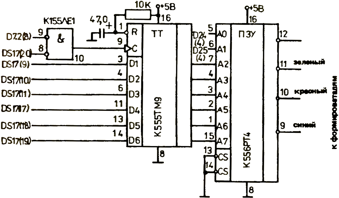 Переделка достаточно проста, но так можно получить лишь четыре основных цвета. Для того чтобы расширить цветовую гамму, я разработал другой способ. Если запрограммировать постоянное запоминающее устройство - ПЗУ так, как показано в табл. 1, то вместо трёх цветов мы получим уже восемь. Цифра 0 в коде означает, что на усилитель подаётся сигнал, т.е. комбинация 001 соответствует тому, что сигнал подан на «зелёный» и «красный» входы - такое сочетание даст на экране жёлтый цвет. Таким образом, всё адресное пространство ПЗУ необходимо разделить на «палитры» (табл. 2). Требуемый цвет в палитре кодируется соответствующей цифрой - для этого используют 001, но последним кодом в каждой палитре должна быть цифра 7, соответствующая чёрному цвету. Когда составление табл. 2 будет завершено, информацию переносят в ПЗУ, как говорят радиолюбители, ПЗУ прошивают. Описание процесса прошивки достаточно известно, его нетрудно найти в радиолюбительской литературе, поэтому подробности я опускаю. Поясню работу схемы в целом. Для выбора палитры используются старшие шесть разрядов адреса. Эти разряды записываются в регистр управления - микросхема К555ТМ9 (рис. 3). Чтобы защитить регистр от случайных срабатываний, на микросхему К155ЛЕ1 поступает сигнал с 15 разряда магистрали процессора адрес/данные. Входы регистра управления подключены к 9-14 разрядам магистрали. Поскольку в регистр управления информация поступает прямо из магистрали, то записывается она инвертированной, а значит, и код палитры необходимо записывать в инверсном виде, например: код 177000(8) установит нулевую палитру, код 176000(8) - первую, а 175000(8) - вторую палитру. Код требуемой палитры записывают по адресу 177716(8). При включении питания автоматически происходит установка режима 0-палитры.
