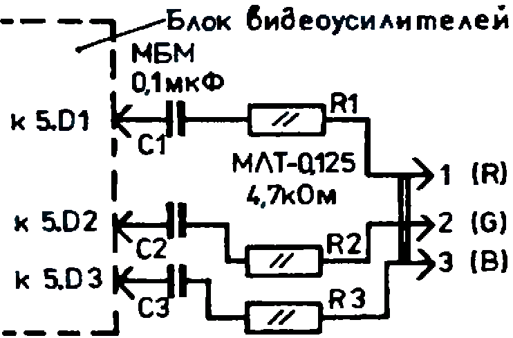 Цветной вариант. Прежде всего нужно сделать в телевизоре отсутствующий там RGB-вход. Эта переделка (кстати, по нашим сведениям, такая работа, выполненная без квитанции в телеателье, стоит 25 рублей, так что есть шанс сэкономить!) выполняется за считанные минуты по схеме, которая изображена чуть ниже. Следующий этап - доработать видеовход, как это делалось для черно-белого варианта. Последний этап - собрать кабель в точном соответствии с третьей схемой.