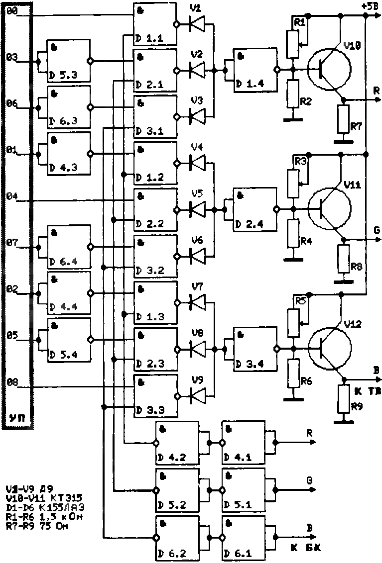 Элементы D4.3-4.4, D5.3 - 5.4, D6.3-6.4 приставки служат для обеспечения стандартного цвета при включении питания и после сброса; элементы D4.1.-4.2, D5.1.-5.2, D6.1-6.2 увеличивают нагрузочную способность БК и формируют уровни ТТЛ выходов цвета; элементы D1.1-1.3, D2.1-2.3, D3.1-3.3 - дешифратор кода палитры; V1-V9 - диодное «ИЛИ», служат также для развязки элементов дешифратора (можно использовать любые маломощные импульсные диоды); D1.4, D2.4, D3.4 приводят сигнал цвета к стандартной полярности; R1-R9 и V10-V12 служат для регулировки уровней цветовых сигналов.