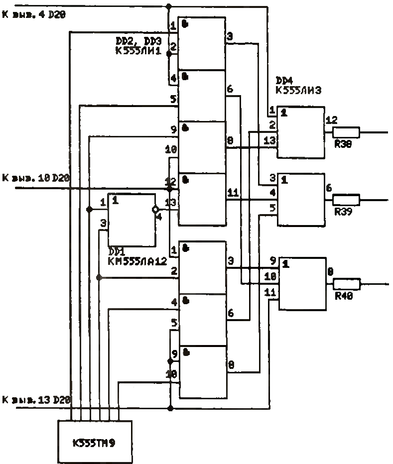 Первая часть переделки для получения трёх цветов остаётся без изменений. После удачного её осуществления необходимо отпаять концы резисторов R38, R39, R40 от дорожек, ведущих к микросхеме D20, и в получившиеся разрывы впаять выводы платы, схема которой приведена на рис. 1. Эта схема представляет собой управляемый коммутатор, который вместе с элементами формирователя цветов компьютера заменяет ПЗУ К556РТ4, предлагаемую В. Кондрашовым. При исправных микросхемах никакой настройки не требуется. Палитры здесь фиксированные, но их количество и разнообразие вполне удовлетворяют любого владельца БК. Ещё больше упростить схему можно путём замены регистра К555ТМ9 регистром выходного порта. При этом выводы порта подпаиваются непосредственно к входам дополнительной платы. Можно использовать те же разряды (9-14), только код палитры необходимо записывать по адресу 177714(8). Неудобство данного изменения в том, что при работе с внешними устройствами через данный порт будет происходить смена цветов. Поэтому можно предусмотреть отключение управления дополнительными цветами, как показано на рис. 2.