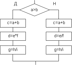 Как видно из блок-схемы, первые и последние операторы в ветвях альтернативы одинаковы. Если первые операторы одинаковы, их можно вынести из альтернативы и поставить до неё. Если одинаковы последние операторы, их можно поставить после альтернативы. В результате мы сэкономим два оператора, и блок-схема примет следующий вид: