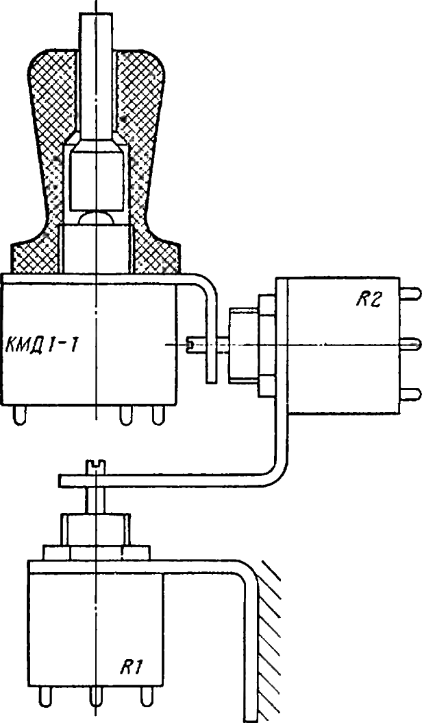 Первый координатный потенциометр R1 угольником прикреплён к основанию; R2 закреплён на оси КП1. Рукоятка, зажимая угольник, навинчивается на микровыключатель КМД1-1 нарезанной в её теле резьбой М8x0,5. В полости свободно размещён толкатель (кнопка), передающий усилие нажима на микровыключатель.