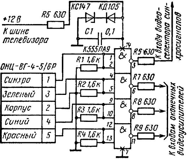 Интерфейс цветного телевизора. На печатной плате микро-ЭВМ «Электроника БК-0010» можно установить элементы связи с RGB-монитором. Цветной телевизор с раздельными оконечными видеоусилителями (УПИМЦТ-61, 3УСЦТ-П-51, 4УПИЦТ-51) можно использовать как видеомонитор (рис. 4). Основное достоинство предложенного варианта - переключение телевизионного приёмника в режим видеомонитора, происходит при стыковке разъёмного соединения с машиной. Это достигается использованием логической микросхемы с открытыми коллекторными выходами, которая при разъединении разъёма за счёт резисторов на входе схемы (R1, ..., R5) отключается от цепей телевизора и не оказывает на него никакого влияния. Выходные сопротивления снижают логические уровни микросхемы до уровня входных сигналов блоков телевизора. Применение микросхем серии К555 позволяет питать схему от телевизионного приёмника через простейший стабилизатор (Д1, Д2, R5).
