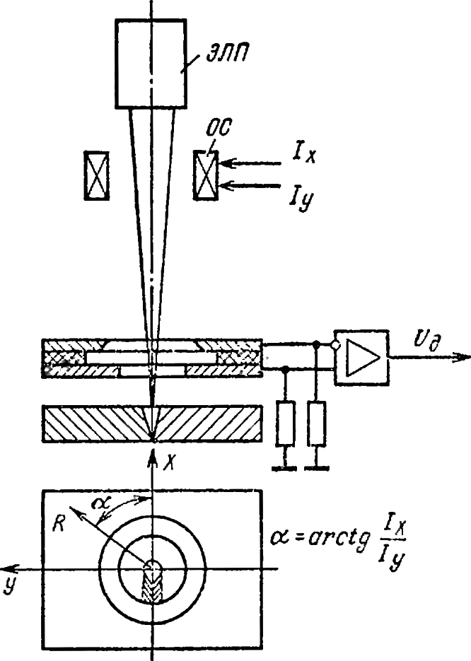 В разработанной системе источником первичной информации служит круговой зондовый датчик (рис. 1), представляющий собой более совершенный вариант дифференциального датчика, использующего принцип «прямого края» [2]. Для получения информации о распределении плотности тока электронный луч необходимо отклонить на пластины датчика в нескольких различных направлениях с одновременным считыванием показаний датчика в память ПЭВМ, где они должны пройти функциональные преобразования.