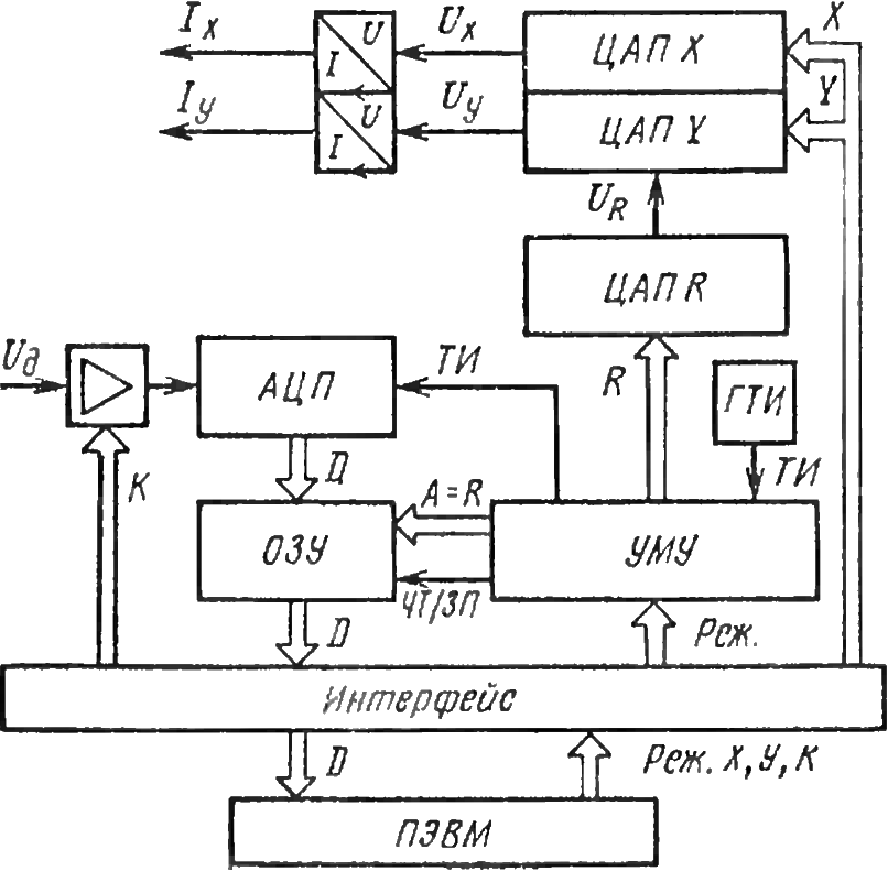 Особенность созданной ССД - отсутствие ручных органов управления. Все функционально важные параметры настраиваются от управляющей ПЭВМ. Для отклонения луча в нужном направлении на ПЭВМ задаются знаки и амплитуды токов, подаваемых на отклоняющую систему. Чтобы нс происходило потери точности аналого-цифрового преобразования при различных уровнях входного сигнала, коэффициент передачи усилителя сигнала датчика программно устанавливается от ПЭВМ так, чтобы максимальное значение ожидаемого сигнала совпадало с допустимой границей входного напряжения АЦП. Из буферного ОЗУ ССД в ПЭВМ может быть считан любой фрагмент данных, что улучшает соотношение сигнал/шум и значительно экономит память ПЭВМ.