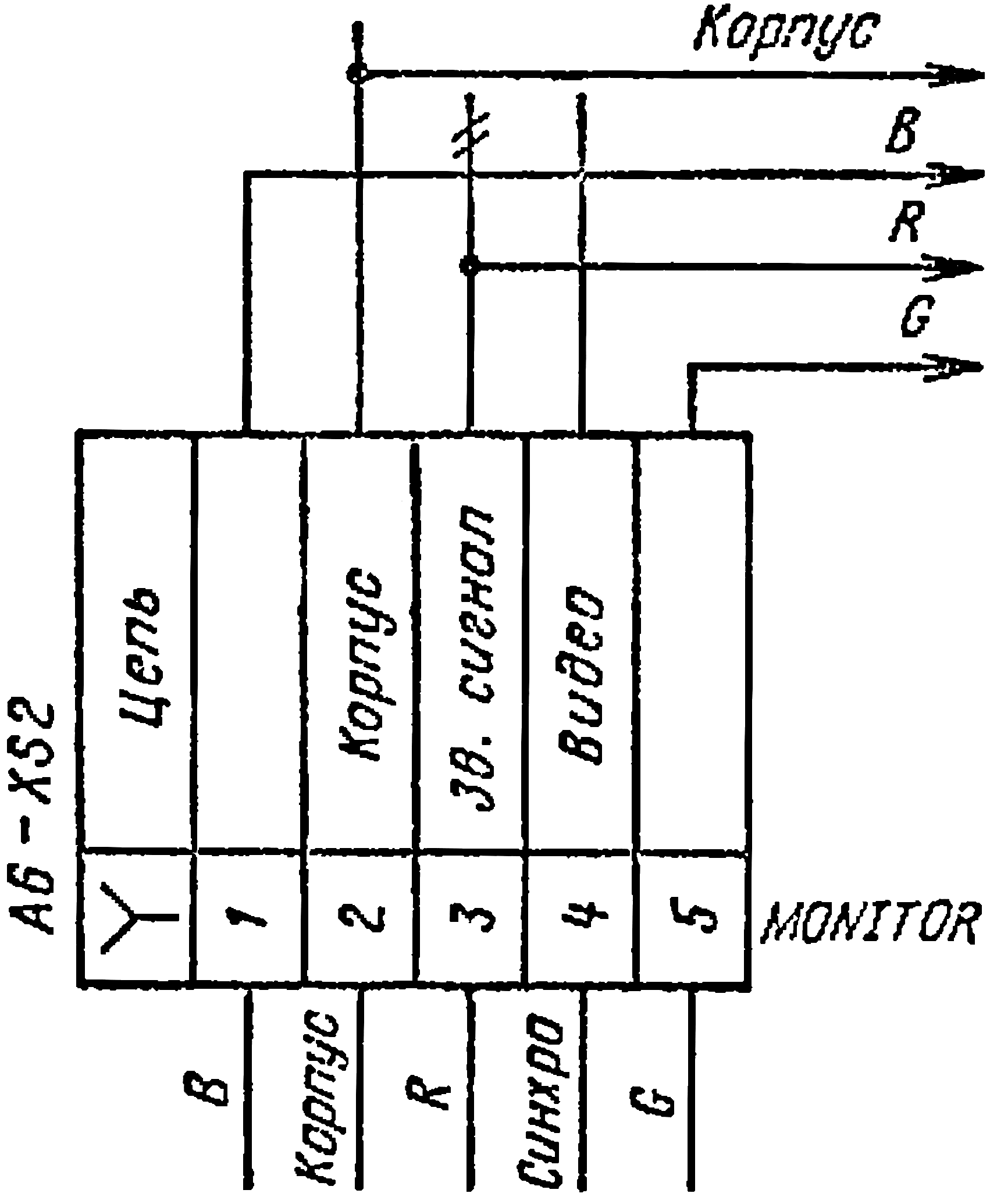 Информационные R-, G-, В-сигналы и синхросмесь от БК-0011 по кабелю ЦТВ поступают па разъём A6-XS2 ТВП «VIDEOSOUND С-431» и через розетку XS2, контакты которой перемонтированы в соответствии с рис. 4, по плоскому жгуту - на разъём, расположенный на плате ВЦ (или БВУ). При этом ТВП в режим УОИ переключается с помощью специального переключателя режимов работы.