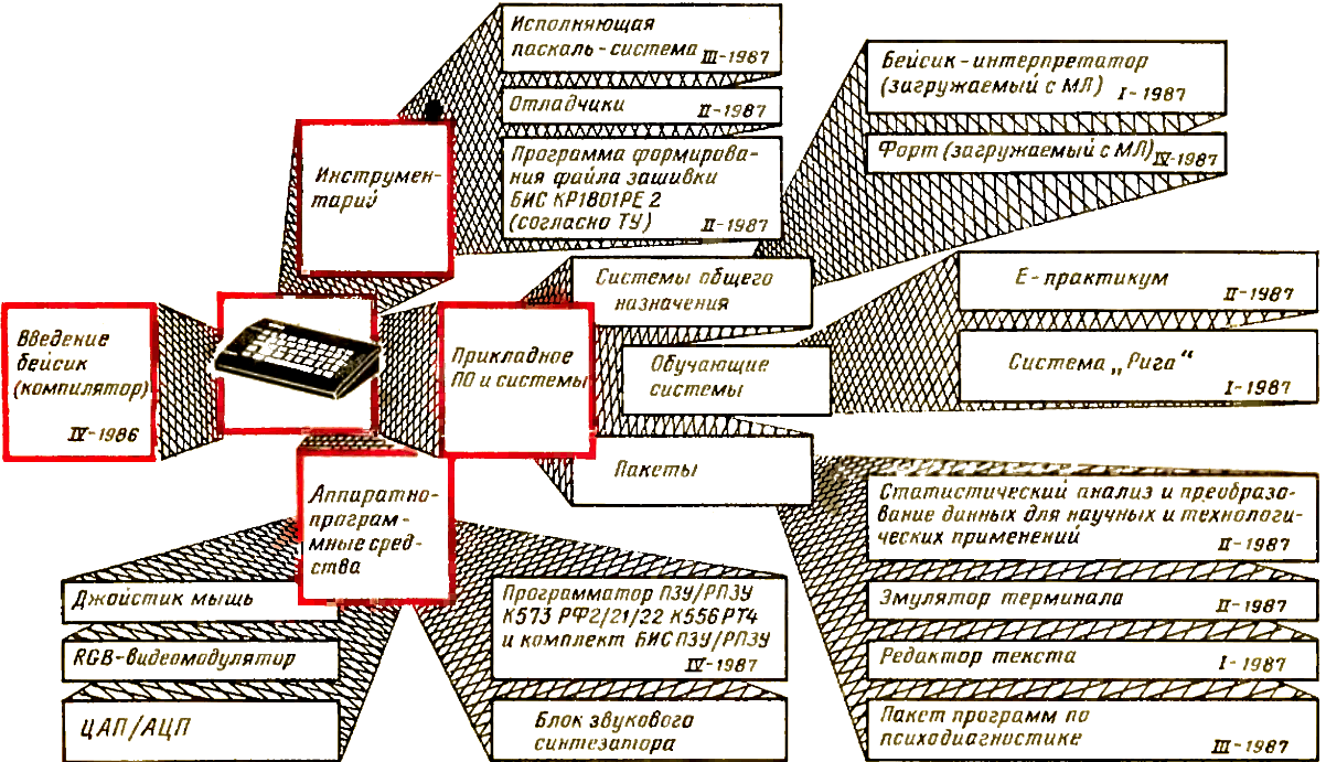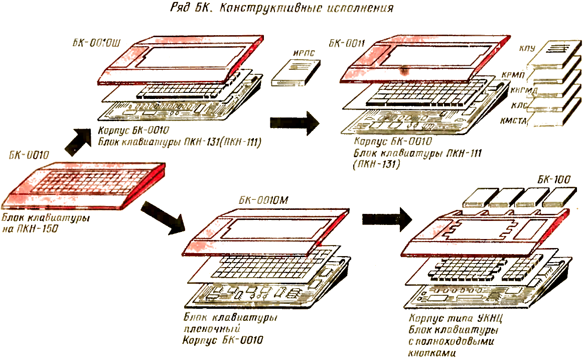 На очереди следующая модель - БК-0011, разработанная и планируемая к выпуску в рамках развития этого семейства микро-ЭВМ Новая модель отличается от БК-0010 расширенными возможностями графики, большим объёмом памяти, широким набором периферийных устройств. Конструктивно (рис. 4) эта модель схожа с БК-0010.01. Используются тот же корпус и нажимная клавиатура. Функциональные возможности БК-0011 расширяются при помощи набора контроллеров (на рис. 4 справа), подключаемых к разъёмам основного модуля. С помощью этих контроллеров совместно с микро-ЭВМ можно использовать печатающее устройство, накопитель на гибких магнитных дисках. Контроллер локальной сети позволит объединять машины в сеть типа «кольцо», а контроллер последовательного интерфейса - в сеть типа «звезда».