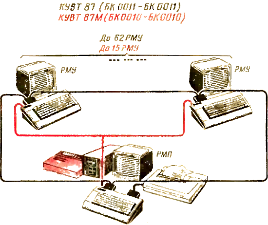 На базе микро-ЭВМ БК-0011 разработан новый комплект учебной вычислительной техники КУВТ-87 (рис. 5). В более раннем комплекте КУВТ-86 использовались модели БК-0010. Они позволяют организовать сеть только по схеме «звезда»; БК-0010 на рабочем месте ученика (РМУ) и центральная машина ДВК-2М на рабочем месте преподавателя (РМП). На новой машине сеть можно строить по схеме «кольцо», и на РМУ и на РМП установлены однотипные БК-0011. В такой сети любая выбранная машина может быть главной (она снабжается печатающим устройством и накопителем на гибких магнитных дисках). Такое решение позволяет значительно повысить надёжность всего комплекса в целом.