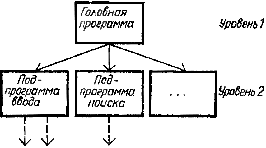 Мы предусмотрительно зарезервировали пустые прямоугольники под функции, которые могут появиться в дальнейшем. Из получившейся схемы явствует, что каждую из стрелок-связей на рис. 1 программно надо оформить с помощью оператора GOSUB. Пунктирные стрелки от нижнего ряда прямоугольников означают дальнейшие вызовы подпрограмм. В самом верху располагается программа-диспетчер, головная программа, вызывающая отдельные операции. Такой головной модуль обязательно существует при правильной организации программы. Он не должен быть большим: его основная функция - дать как бы план или конспект всей программы, с необходимыми комментариями и описаниями переменных и массивов в начале и последующими вызовами тех или иных подпрограмм.