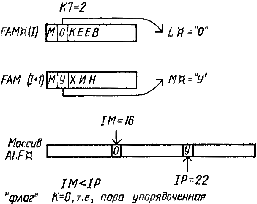 Оператор в строке 346 опрокидывает флаг в «упорядоченное» положение. В переменные L$ и M$ помещаются первые символы сравниваемых элементов массивов. Если (строка 349) хотя бы одна из фамилий не начинается с двоеточия (содержит русские буквы), надо начинать сравнивание по нашему алфавиту. Если же обе фамилии начались с двоеточия (латинские буквы), нам достаточно обычного сравнения в строке 350. Цикл сравнения кириллицы (строки 345-366) отделяет в переменные L$ и M$ очередные символы для сравнения, производящегося в строках 357-360. Указатели IM и IP устанавливаются (см. рис. схемы подпрограммы) при совпадении очередных сравниваемых литер с литерами алфавита в строках 52-56.