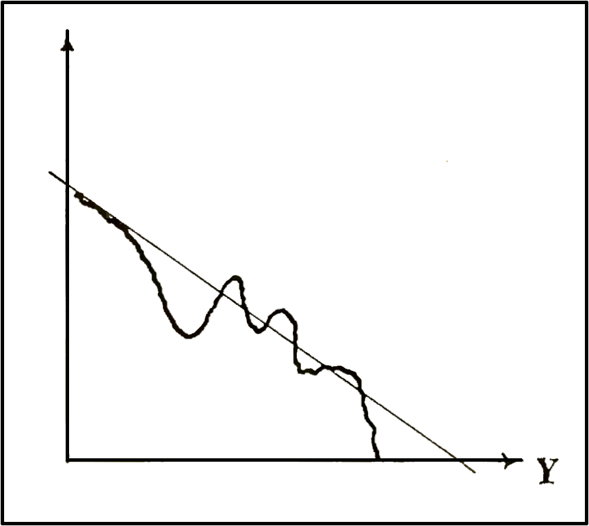 То, что может появиться в результате предложенного построения, примерно изображено у нас на рисунке, причём это именно рисунок. Там же проведена идеальная теоретическая прямая (пусть читатели сами попытаются найти её наклон). Ясно, что мы применили здесь шуточное методологическое правило не случайно, но зная наперёд, чем должно кончиться дело. Видно, однако, что, как и в случае собственно броуновского движения, «экспериментальные» точки не слишком хорошо ложатся на теоретическую прямую, причём изображённые на рисунке особенности довольно устойчиво воспроизводятся при самых разных вариантах использования функции FRAN.