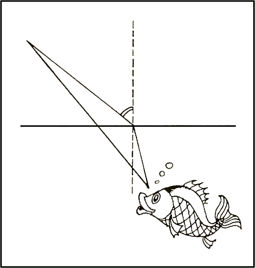 Теперь легко можно заметить, что источник виден не там, где он действительно находится (это ещё просто), и что его положение зависит от положения глаза наблюдателя и к тому же ещё от того, насколько широко он (или она - рыба!) раскроет глаза. Видны ли эти неожиданные особенности на вашем дисплее?