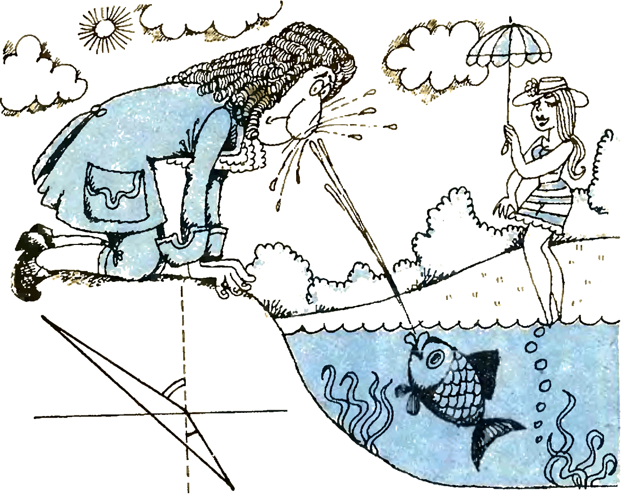 Сцены охоты рыбок-брызгунов, сбивающих мух струйками воды, недавно мелькали на наших телевизорах в серии передач «Живая планета». Рыбки ухитряются решать нашу задачку, не будучи отягощены знакомством ни с законом Снеллиуса, ни с принципом Ферма, не говоря уже о его великой теореме. Здесь лишний раз уместен довольно общий вопрос приобретают ли они эти тонкие навыки тренировками или наследуют?