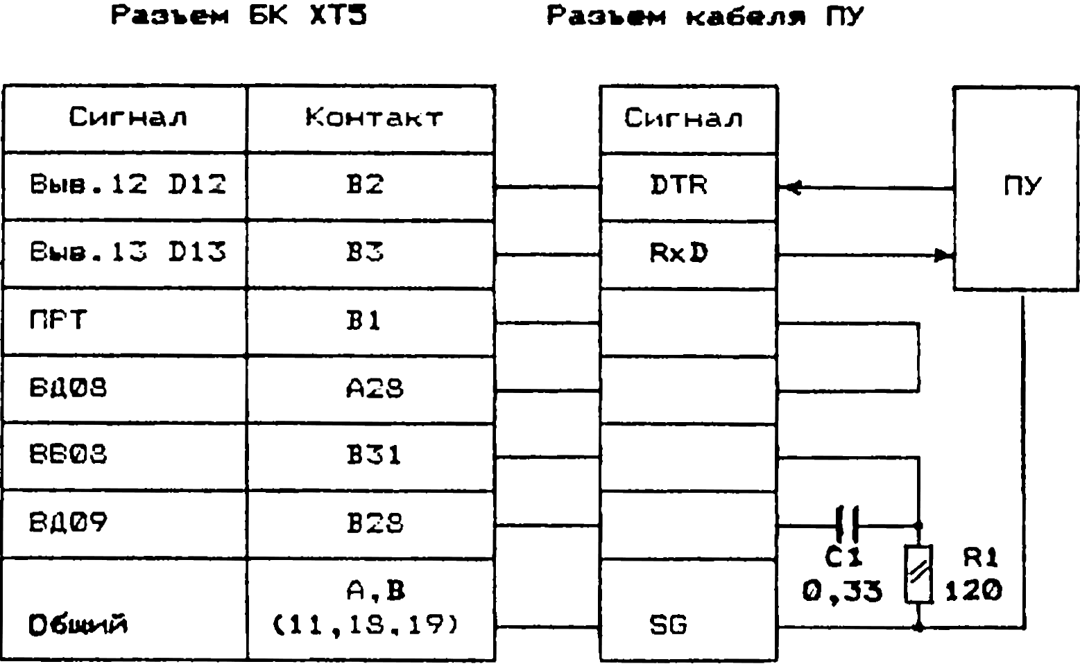 Таким образом, с аппаратной точки зрения для подключения к БК принтера с последовательным интерфейсом стандарта RS-232C (или ему подобных V24, стык С2) достаточно иметь трёхпроводной соединительный кабель, в котором к двум выше описанным линиям добавляется линия "земля". С программной точки зрения организация вывода данных на ПУ легко осуществляется путём размещения в программе пользователя запроса программного прерывания ЕМТ 42 или ЕМТ 46.