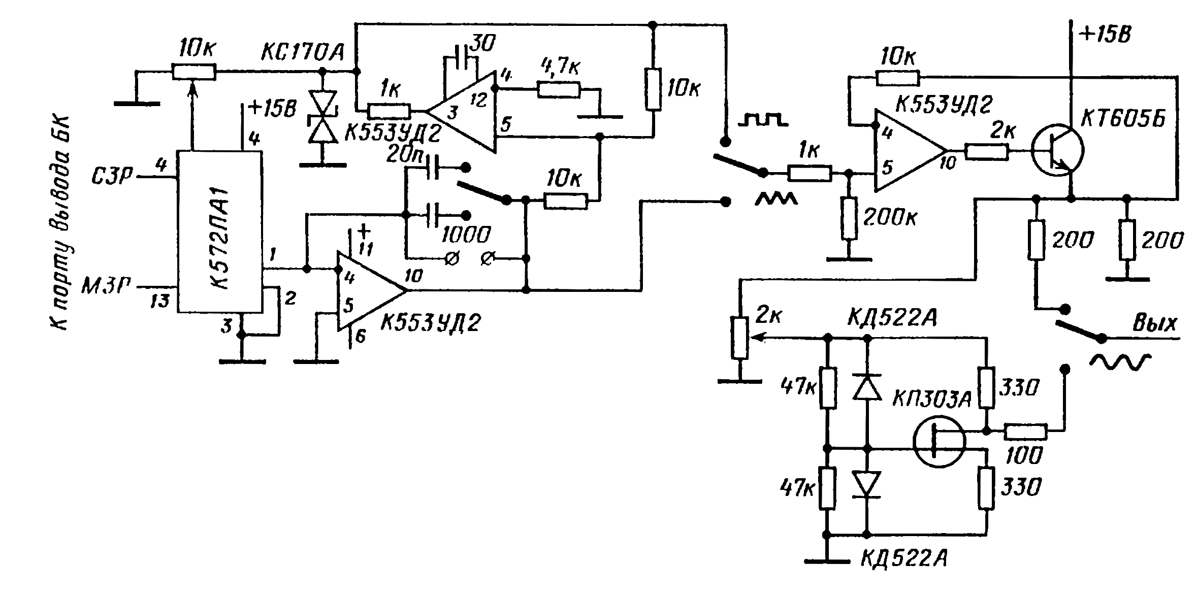 Микросхема К572ПВ1 по паспортным данным обязана работать до максимальной тактовой частоты 250 кГц, так что темп опроса её может достигать 10 кГц. Для БК (по крайней мере с нашими программными средствами) это слишком резвый темп, поскольку даже при работе с внешним тактовым генератором он еле-еле успевает проделать десяток измерений в секунду. Тем не менее для записи не слишком быстрых процессов весь наш агрегат можно использовать в качестве своеобразного шлейф-осциллографа: