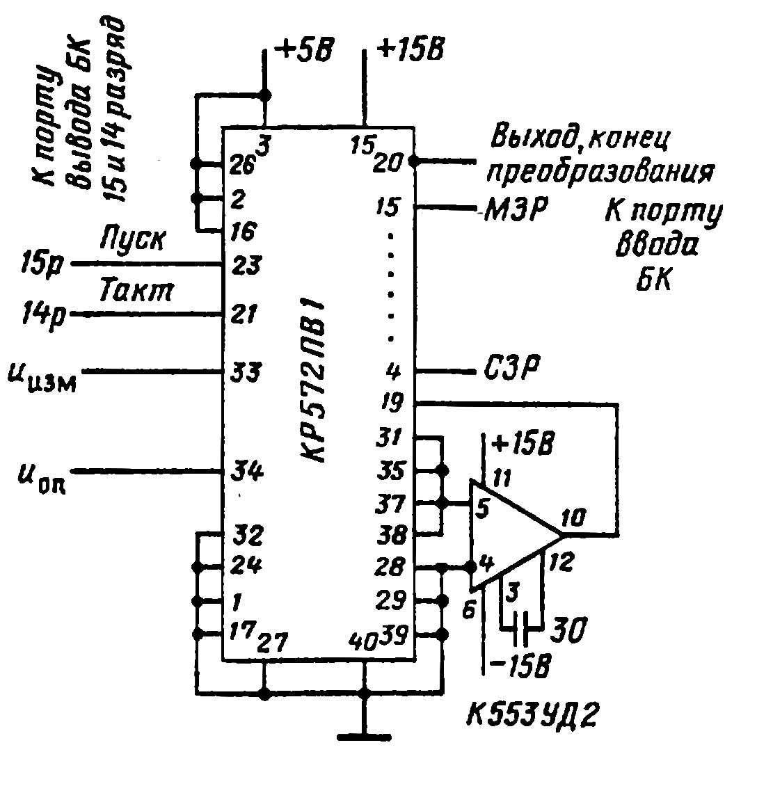 Хотя микросхема ПВ1 объединяет массу сложных и разнородных узлов, для построения полной схемы АЦП потребуется (помимо источника питания на : В и + 15 В) ещё как минимум два дополнительных элемента - компаратор и источник опорного напряжения (рис. 5).