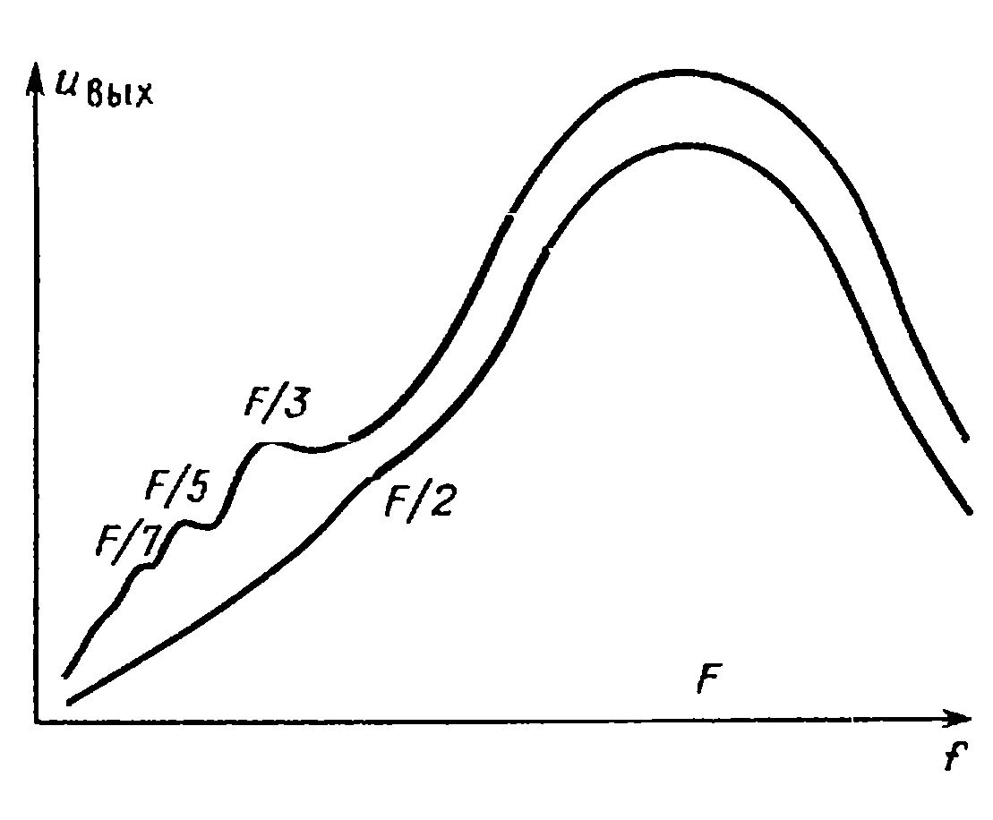 На приводимом нами рисунке (увы! - это снова лишь рисунок с экрана) изображён отклик фильтра на синусоидальное напряжение от нашего генератора и на меандр с той же амплитудой. Чётко видны отклики на нечётные гармоники меандра (вплоть до седьмой) при отсутствии чётных гармоник, что говорит о правильной скважности меандра. Лёгкая выпуклость на синусоидальном отклике в области, соответствующей второй гармонике (рис. 7), означает небольшую асимметрию нашей псевдосинусоиды. Возможна настройка синус-преобразователя именно по минимуму этого пика. Наша же схема была настроена на глазок по снятой БК "осциллограмме". Видно, что такая настройка достаточна для целей наших измерений (отметим, что нечётные гармоники в синусоиде также практически отсутствуют).